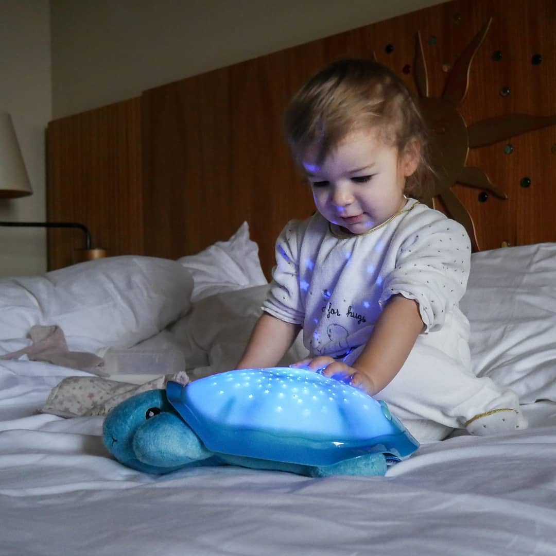 Il appuie sur les boutons et hop la magie opère, différentes couleurs et les étoiles et la lune illumine le plafond pour qu’ainsi il puisse trouver le sommeil paisiblement 🐇