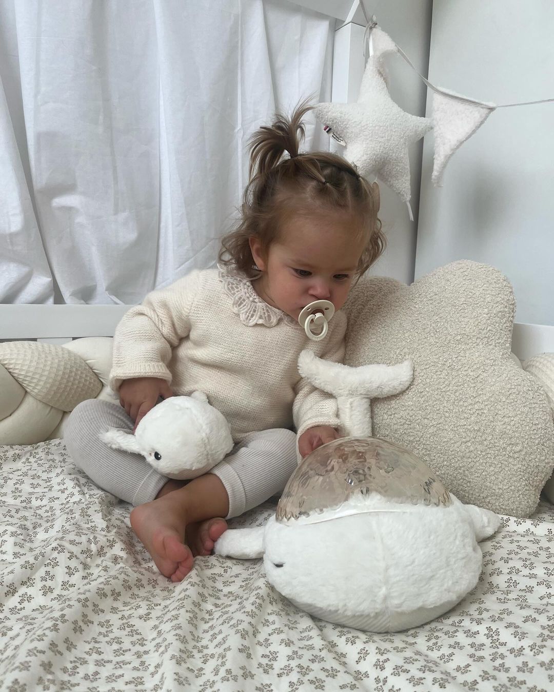 Recently I got this Tranquil Whale family with soothing white noise and night projector from@cloudb_caand this is her whole day companion now! She sleeps with them at night as it projects a moving ocean light effect onto the ceiling of the room and plays a calming melody sound of the waves which helps her soothe to sleep!