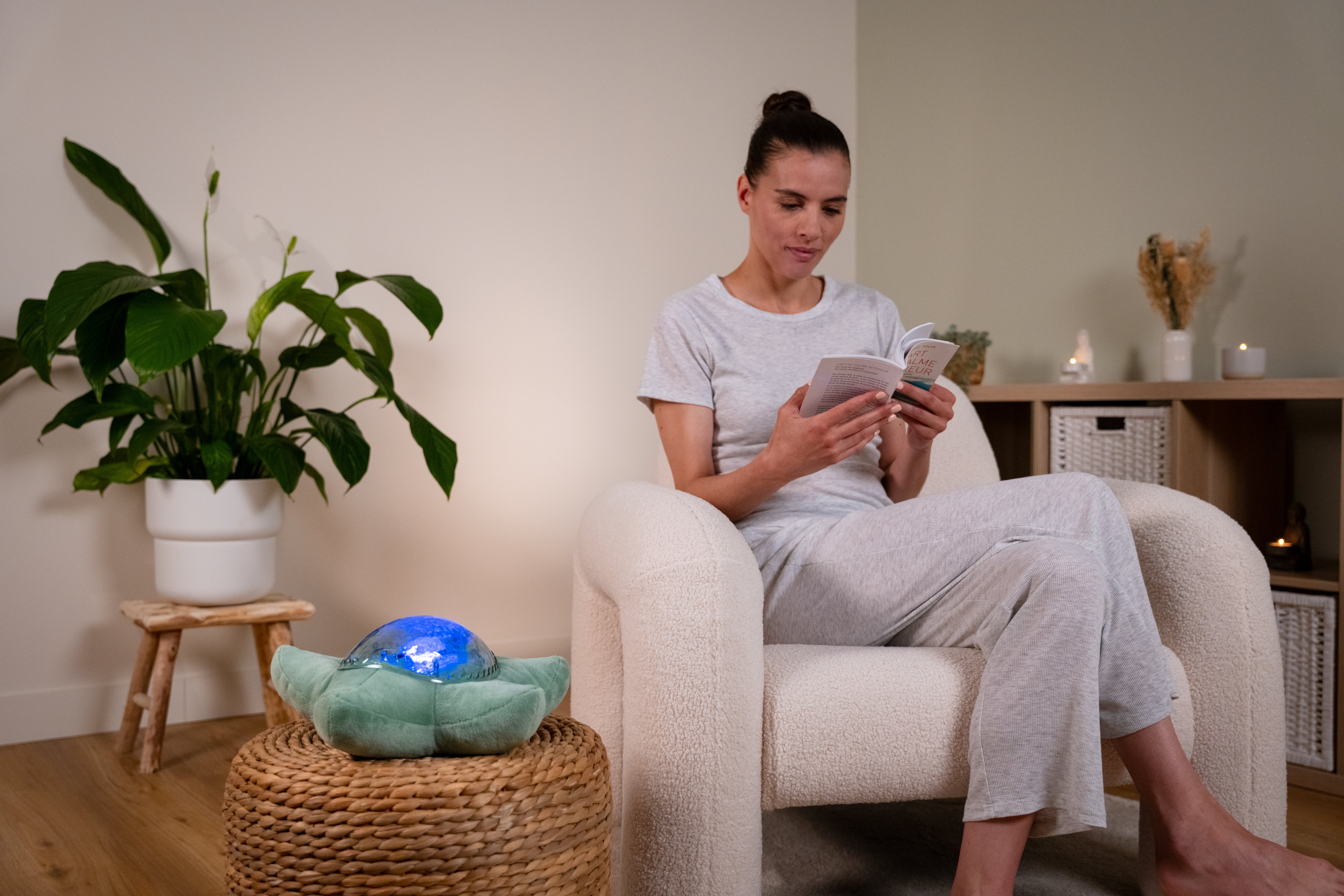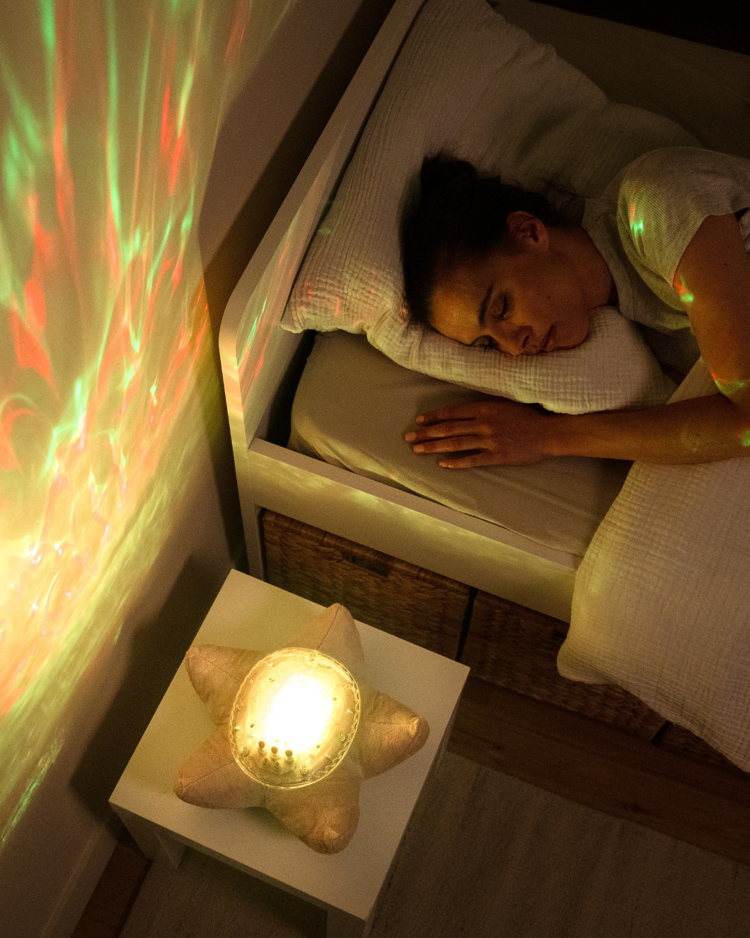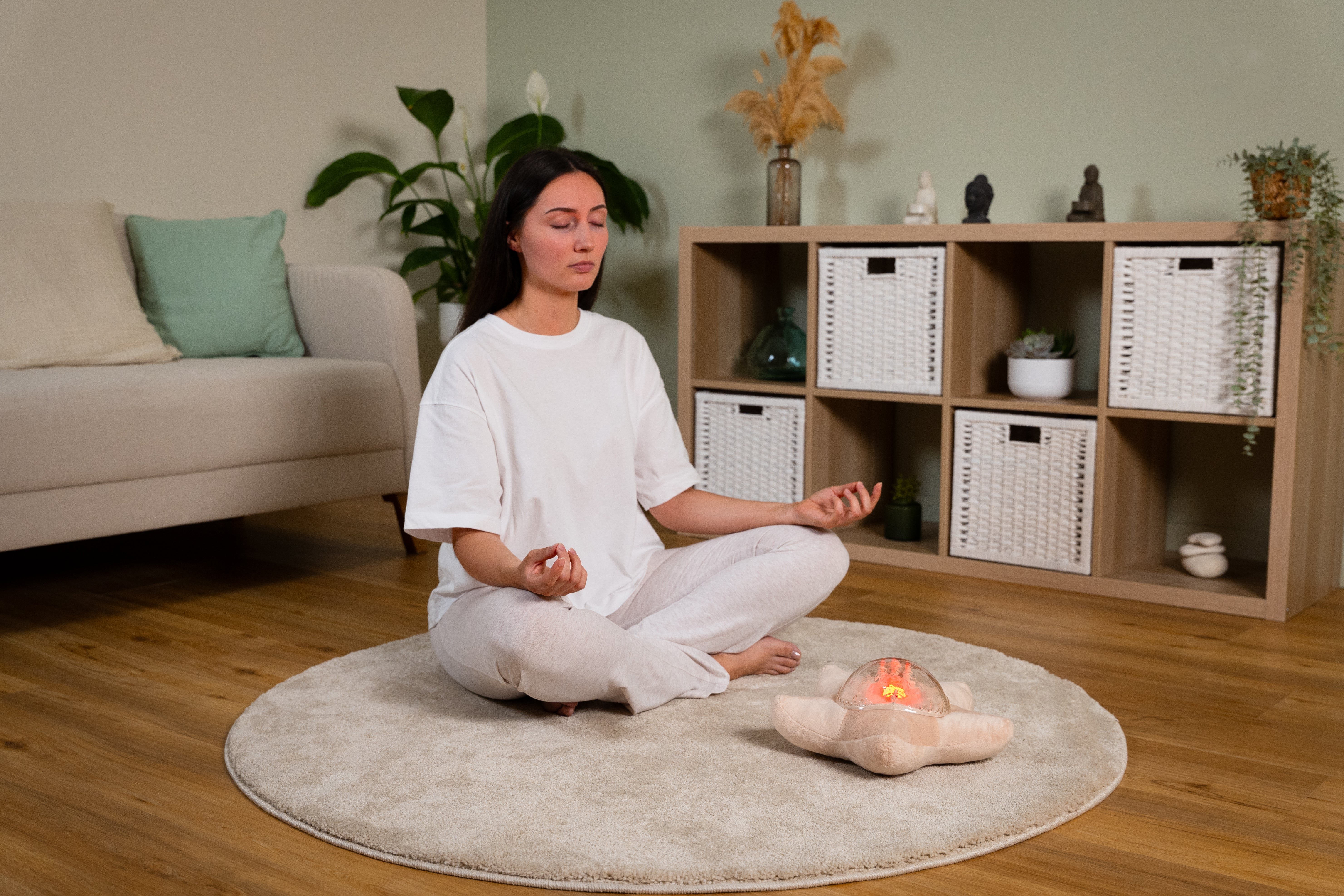 Zen Lotus™ crée une ambiance apaisante idéale pour les adultes en quête de détente, de méditation ou d’un endormissement plus serein, grâce à ses projections lumineuses et sons relaxants.