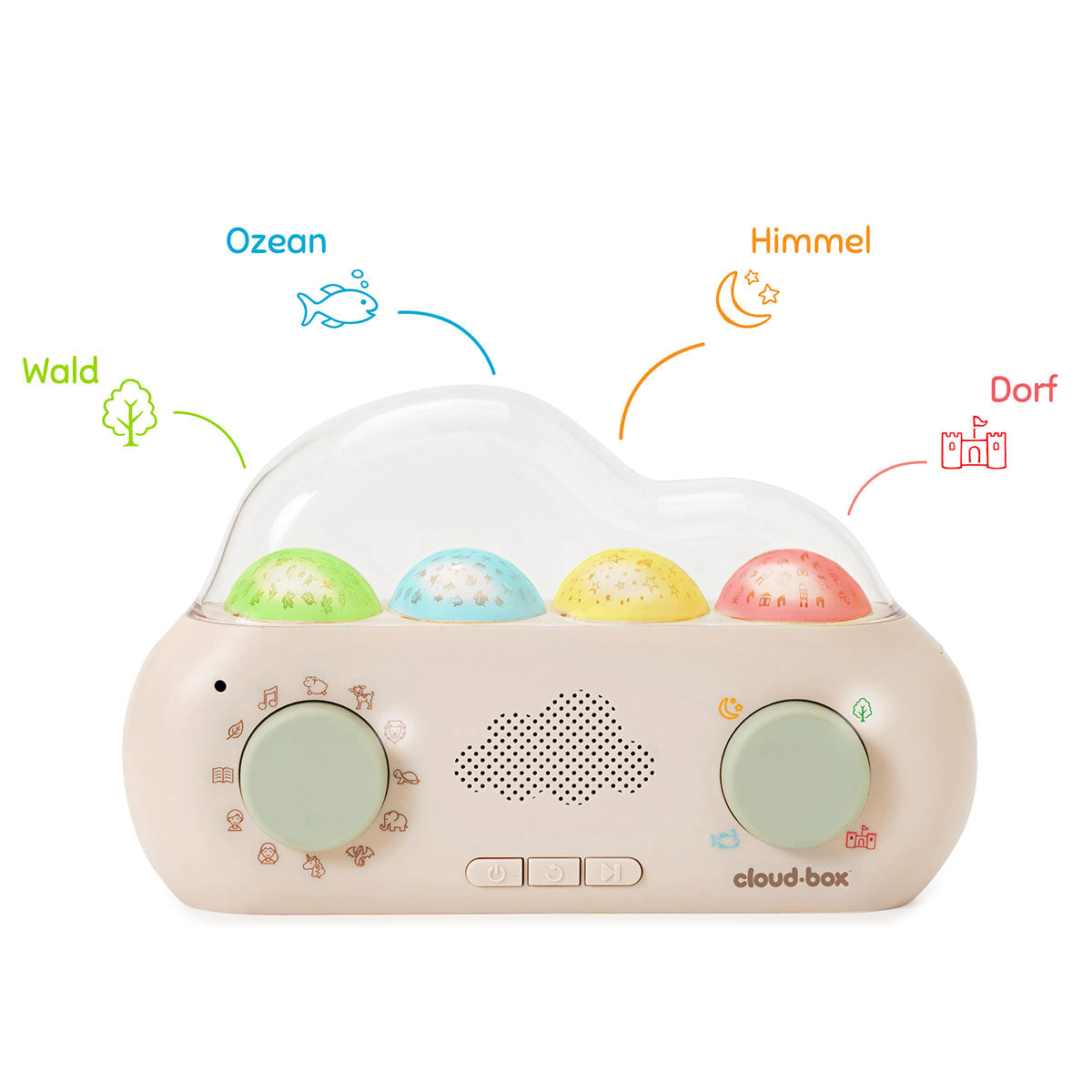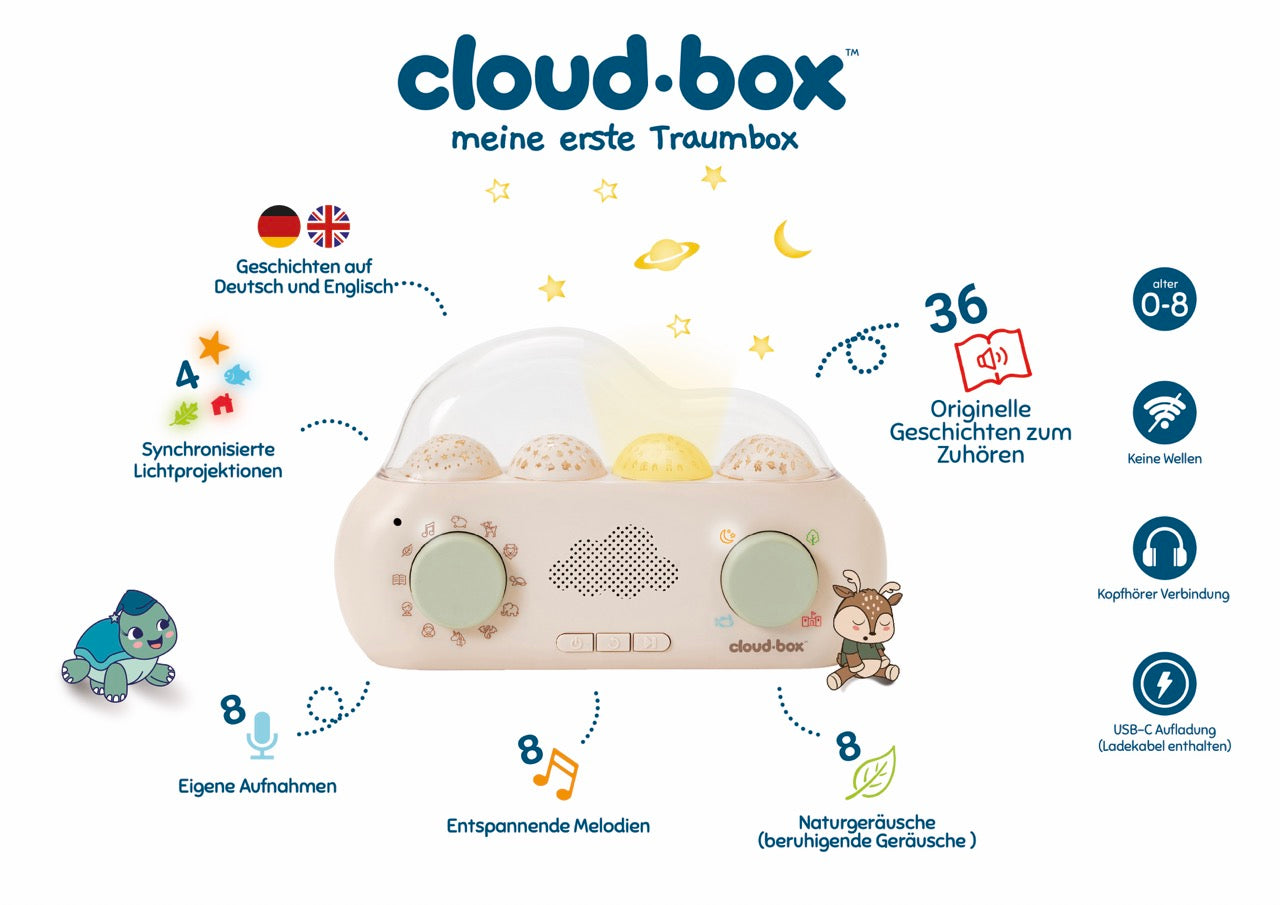 CloudBox™ kann von Kindern im Alter von 0-8 Jahren genutzt werden und wird mit einem illustrierten Märchenbuch geliefert."